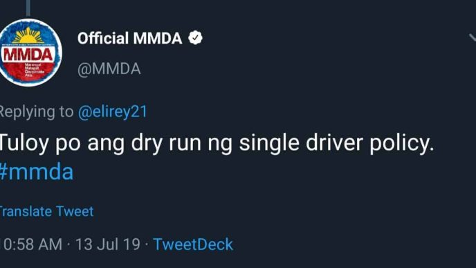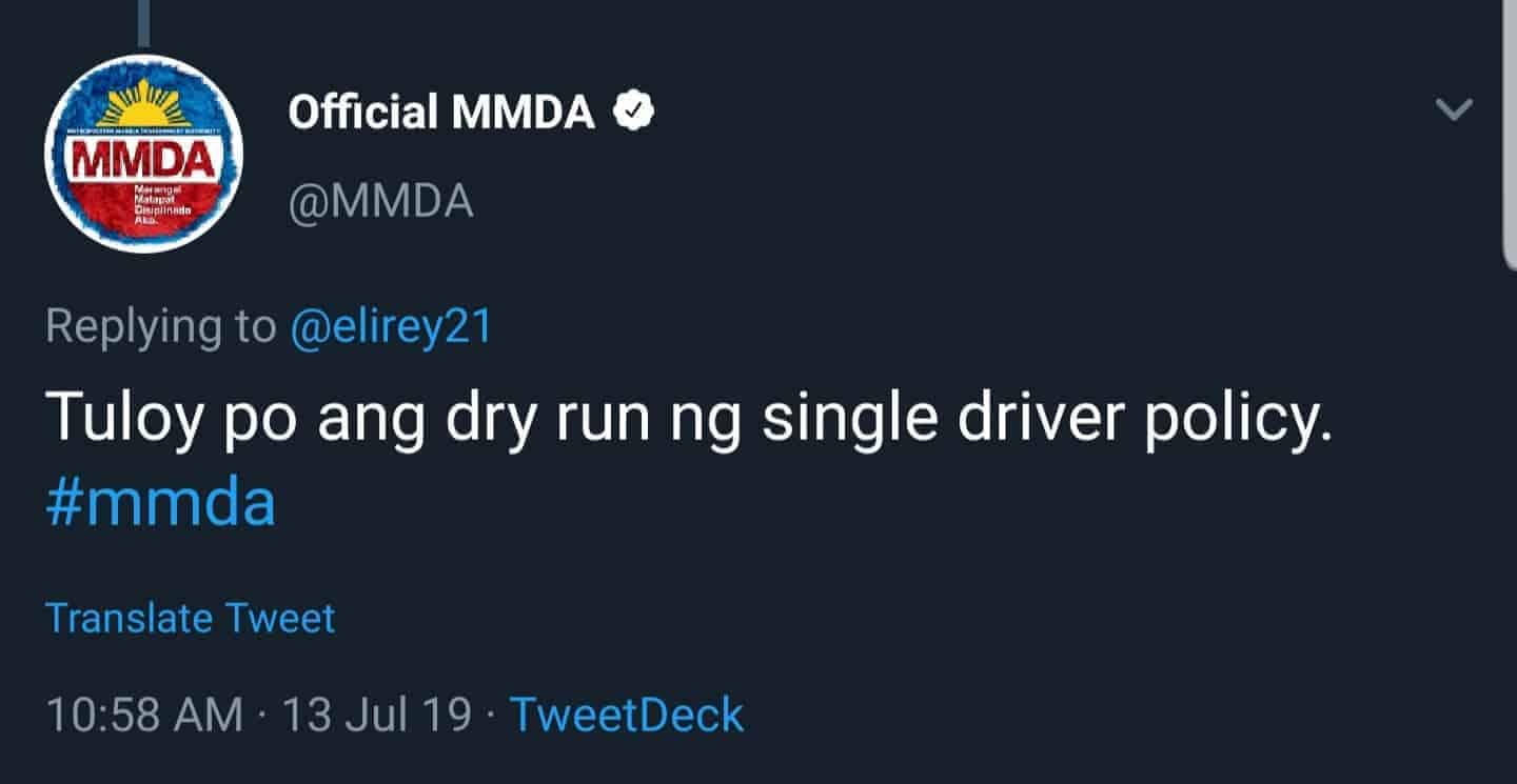 “Tuloy po ang ng single driver policy,” MMDA said in reply to two users.
