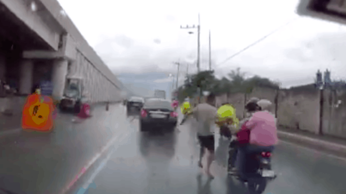 In a Facebook post by Ernest Gidoc, dashcan video shows a man in a pink shirt suddenly emerging from the underpass around 5 p.m. The man runs across the road in an apparent bid to run away from a knife-wielding man when incoming motorcycle hits him.