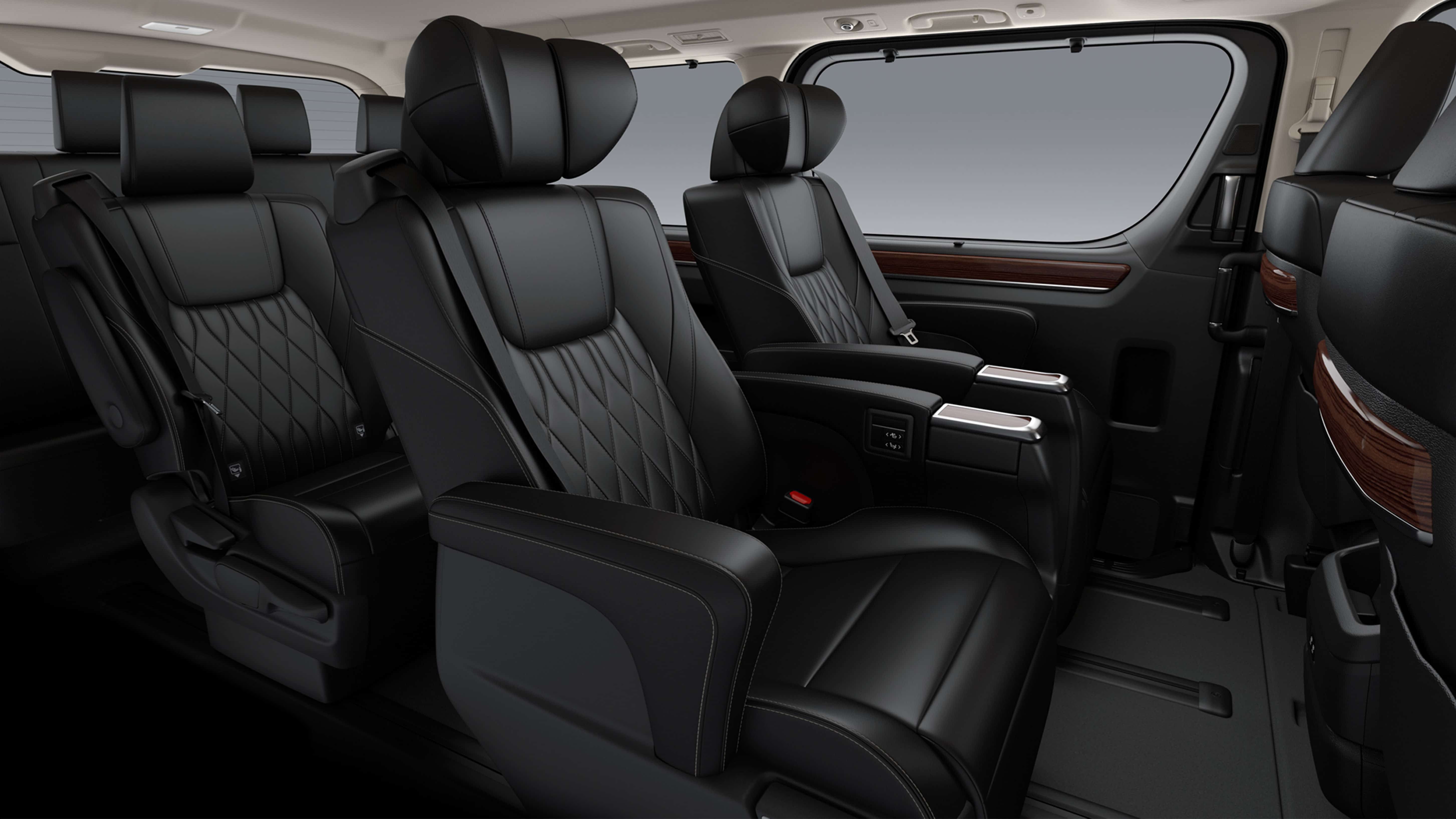 The Hiace Super Grandia’s front fascia has an elegant yet muscular front grille that flanked by bi-beam LED head lamps. It is emphasized with side chrome linings that stretch to the rear.