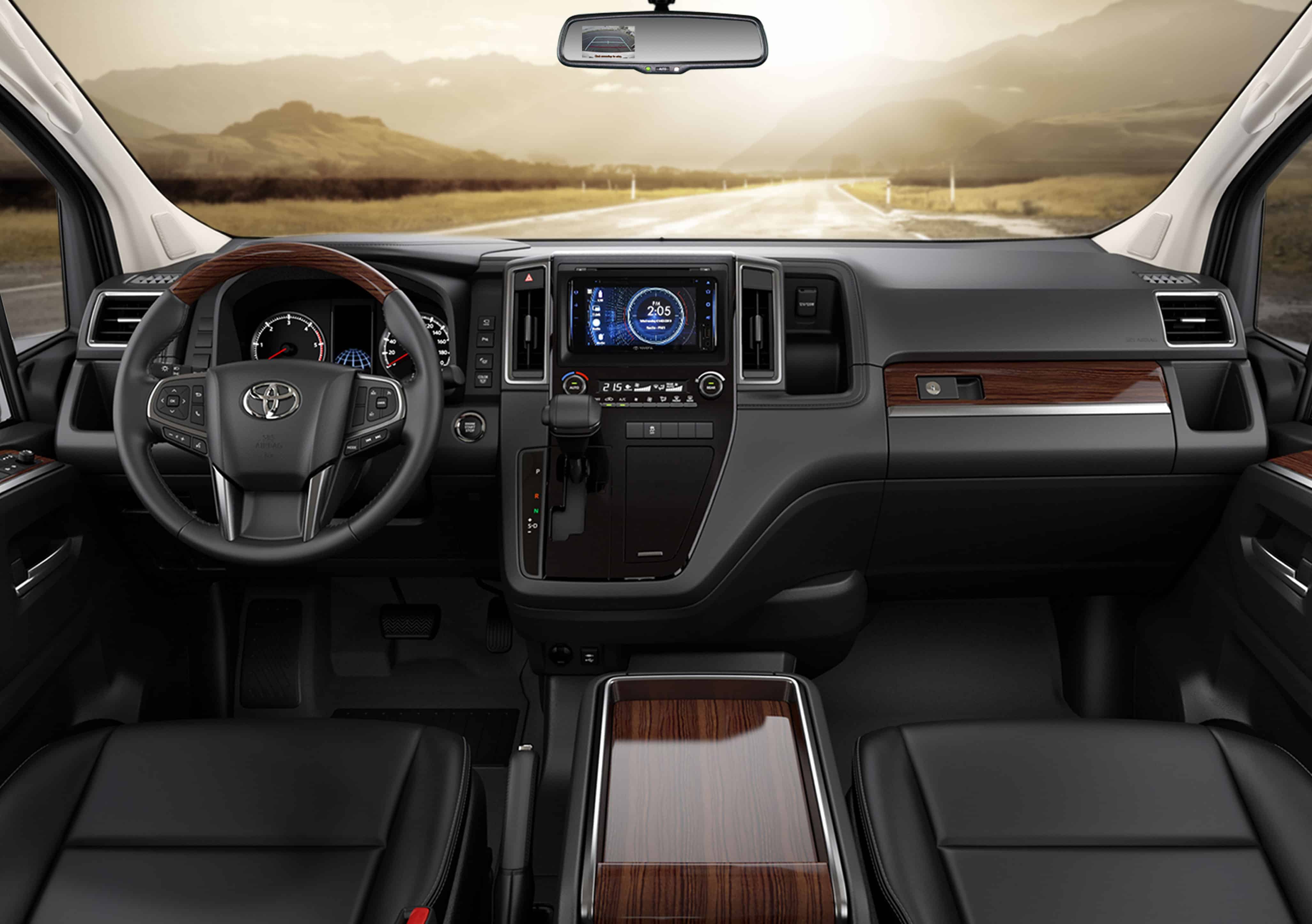 The Hiace Super Grandia comes with an array of standard safety features such as anti-lock brakes, vehicle stability control with brake assist, hill start assist, clearance and back sonar, back monitor, nine airbags, emergency locking retractor, and three-point seatbelts.