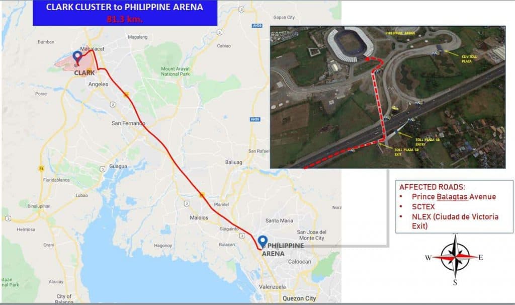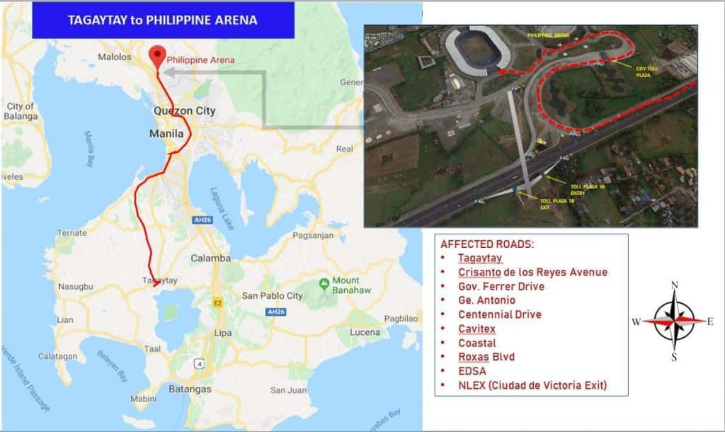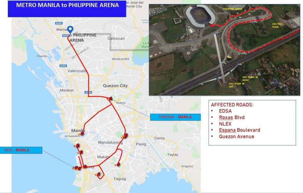 “(A) convoy of vehicles will travel from various hotels and establishments within Metro Manila, Tagaytay, Clark, and Subic to Philippine Arena, the venue of the opening ceremony of SEA Games 2019… Stop-and-go traffic scheme shall be implemented on identified roads,” the agency said.