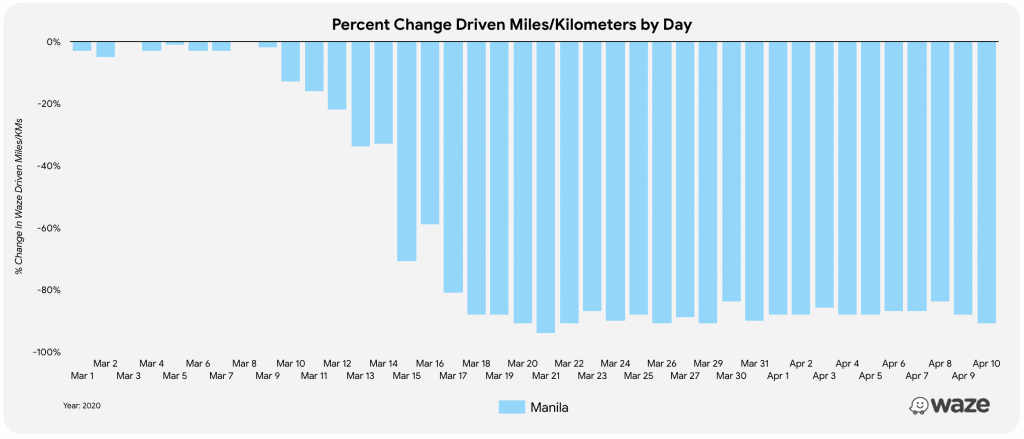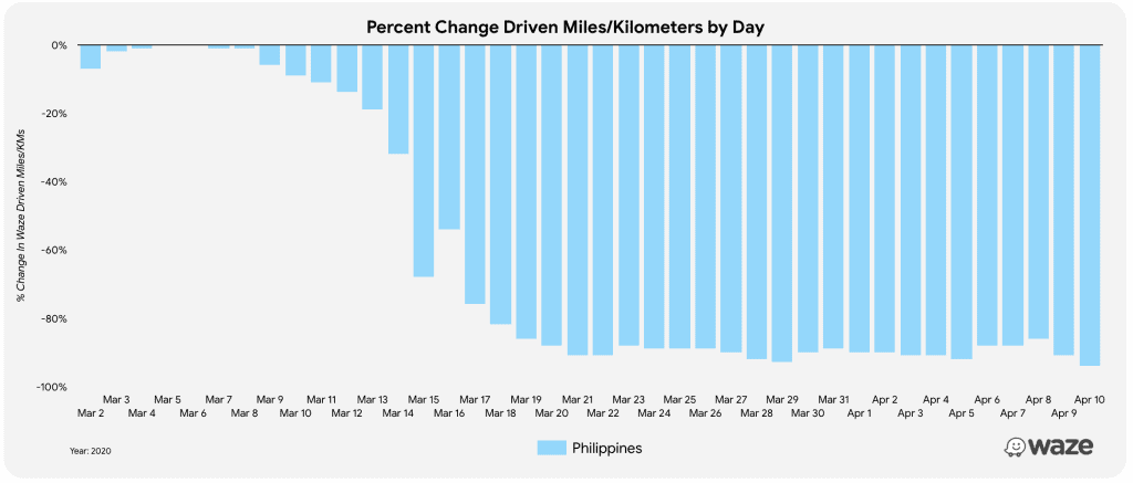 Waze data shows that across the world, most countries have dramatically stopped driving. Globally, Waze users are driving 60% fewer kilometers compared to the February daily average for a two-week period (2/11/2020-2/25/2020). In line with the global trend, with the Luzon-wide Enhanced Community Quarantine (ECQ) measures in place, Waze users in the Philippines are also driving significantly less (88% fewer kilometers) compared to the same February daily average.