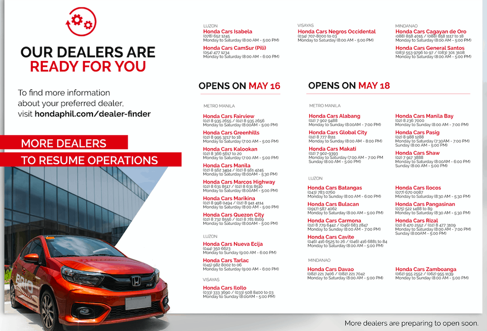 Honda Cars Philippines, Inc. (HCPI), Honda’s automobile unit in the Philippines, announced the resumption of its dealer sales and after-sales operations starting May 16, 2020.