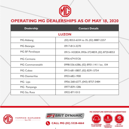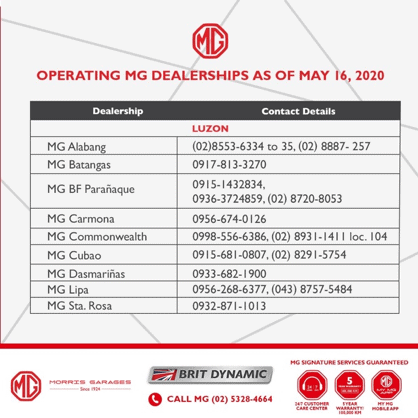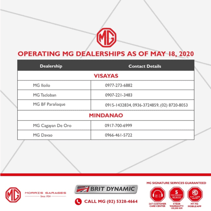 More MG dealerships are scheduled to open as the quarantine status of different areas around the country adjust, so please stay tuned to MG Philippines’ social media accounts, OfficialMGPhilippines (Facebook) and @mg_philippines (Instagram and Twitter) for these forthcoming announcements.