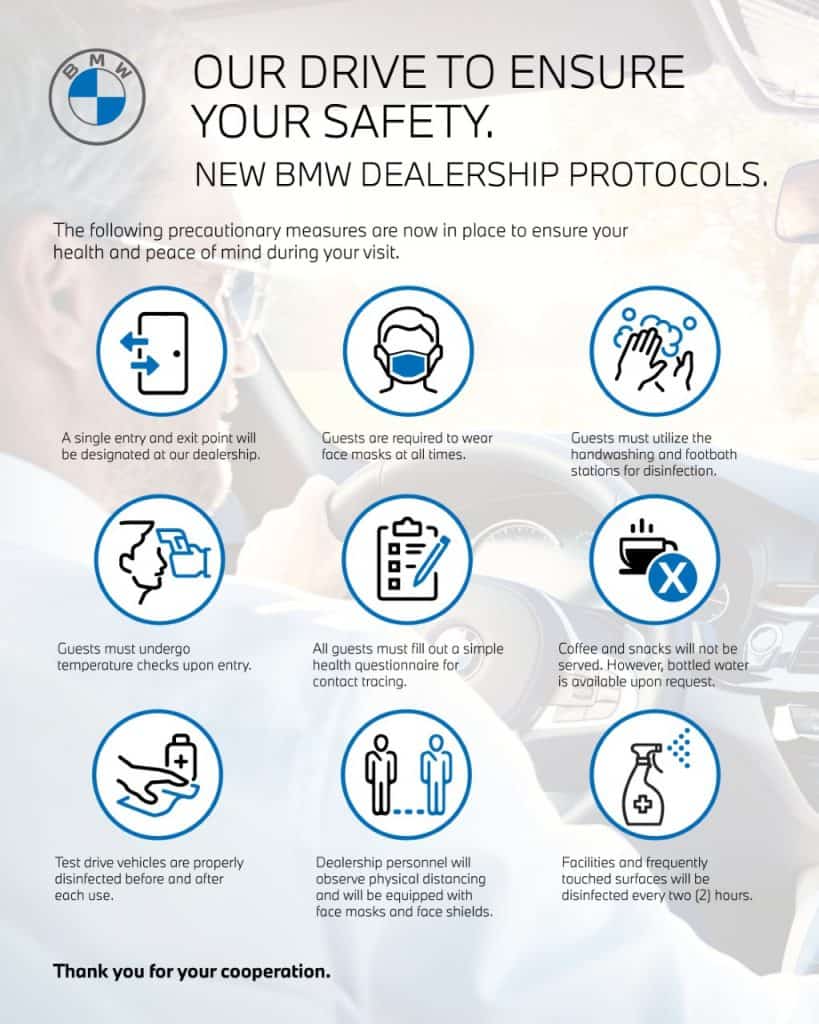 To ensure a safe, comfortable, and enjoyable experience for everyone, the BMW network has implemented a comprehensive set of safety protocols that will be observed by dealership personnel and guests at all times:
