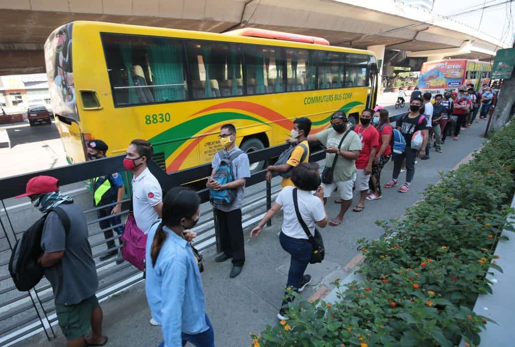 As early as 4 a.m. today, commuters have flocked Quirino Highway in Fairview, where some buses in the new Angat-Quezon Avenue route are waiting for passengers. Only 29 passengers are allowed to board each bus and temperature checks are mandatory.