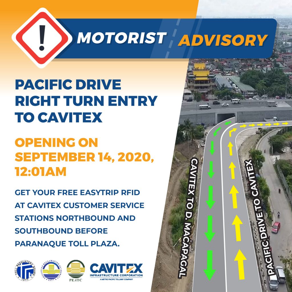 Cavitex Infrastructure Corporation (CIC) announced on Friday that the Pacific Drive entry to the Manila-Cavite Expressway (CAVITEX) will be opened to motorists beginning September 14, and is expected to serve up to 90,000 vehicles daily.