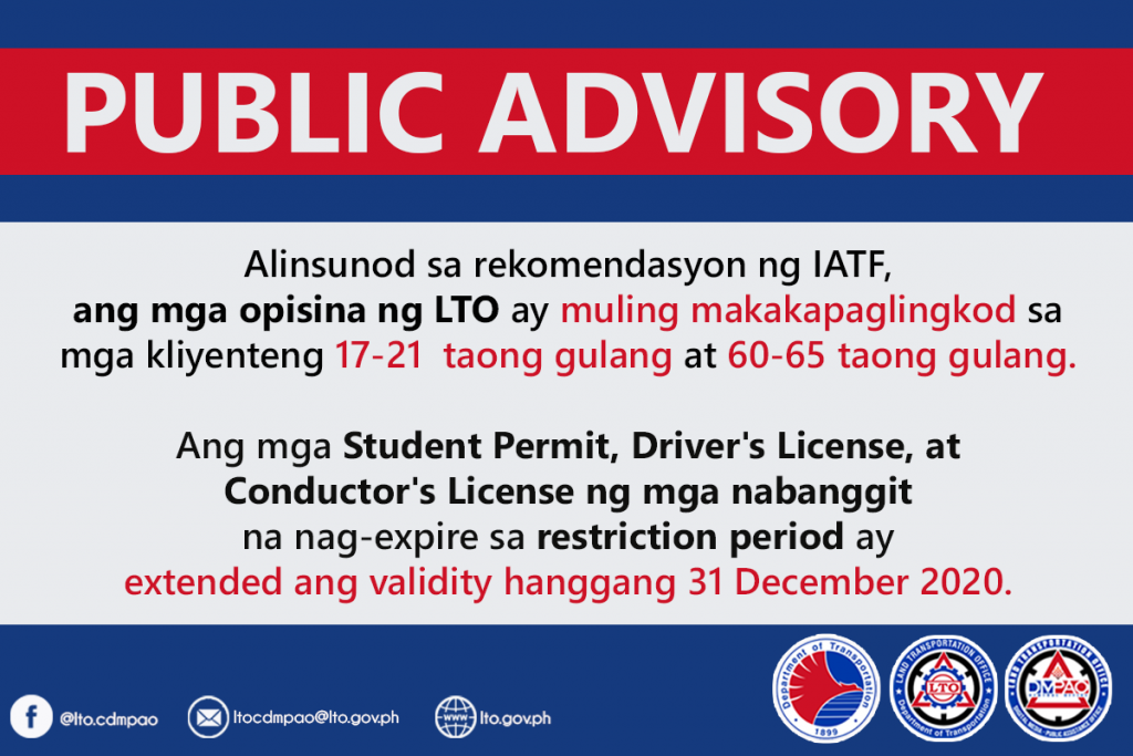 “Ang mga Student Permit, Driver’s License, at Conductor’s License ng mga nabanggit na nag-expire sa restriction period ay extended ang validity hanggang 31 December 2020,” it said.
