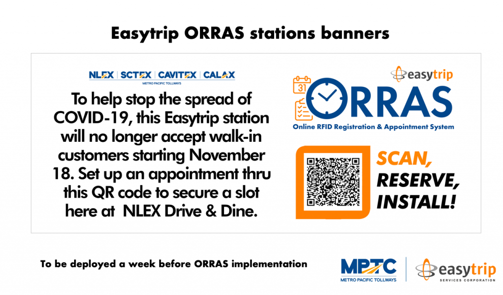 Easytrip Corp. has launched the Online RFID Reservation and Appointment System (ORRAS) to provide users of the Metro Pacific Tollways (MPTC)’s network an alternative and pre-booked way to get their RFID sticker.