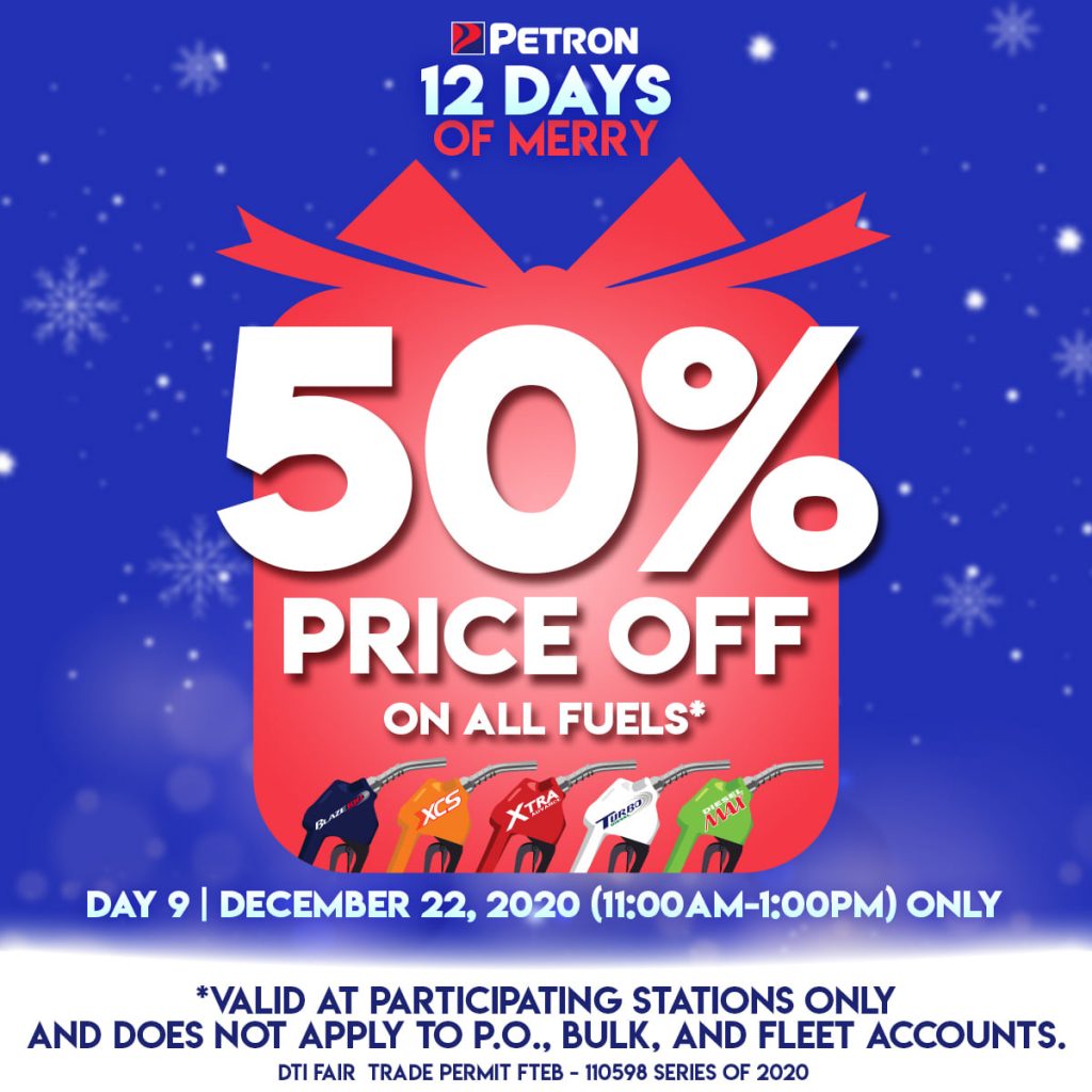 “The 12 Days of Merry promo is Petron’s way of rewarding its Petron Value Cardholders. On Day 9, however, our President and CEO Ramon S. Ang is extending this special promo even to non-PVC cardholders: customers enjoy 50% off on all Petron fuels when they gas up on December 22, 2020, between 11AM to 1PM, at over 1,100 participating Petron stations nationwide,” Petron said.