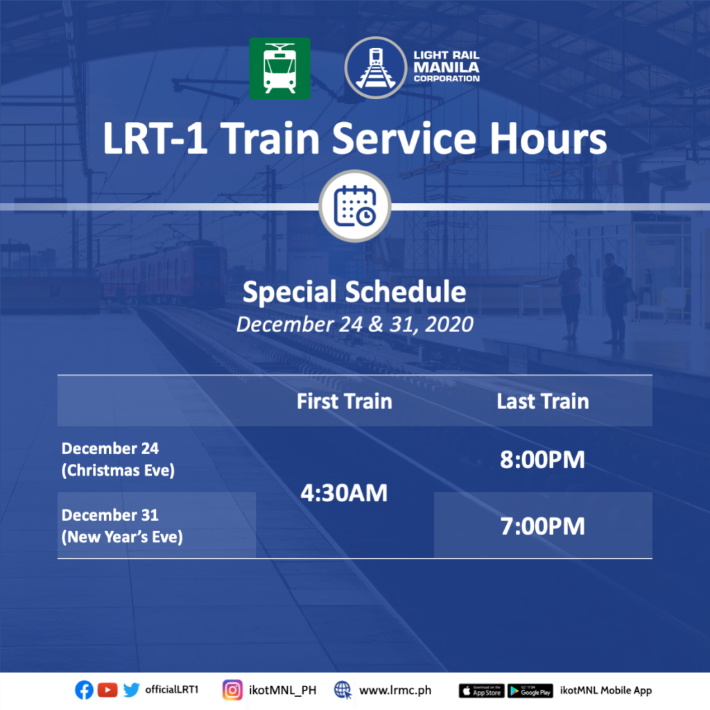 Meanwhile, the LRT-1 will continue to serve passengers on December 25, December 30, and January 1.