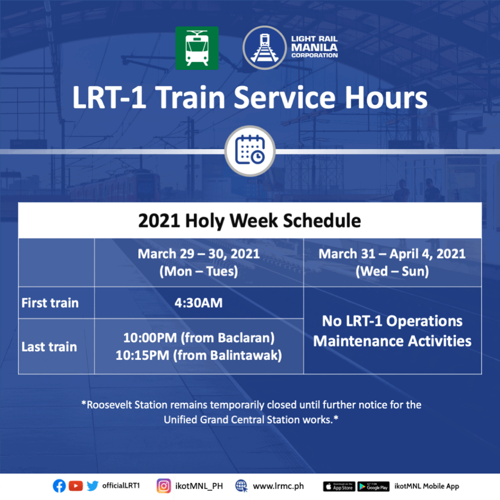The Light Rail Manila Corporation (LRMC) has announced that operations of LRT-1 will be temporarily suspended during the Holy Week.