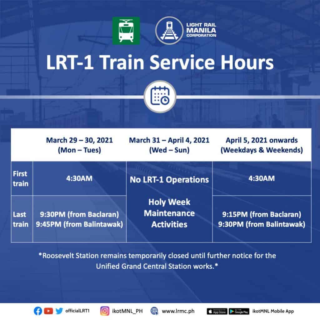 As previously announced in the Holy Week schedule advisory, LRT-1 operations will be temporarily suspended from March 31 (Holy Wednesday) to April 4, 2021 (Easter Sunday) for the annual maintenance and rehabilitation works to facilitate continuous improvements to the LRT-1 system.