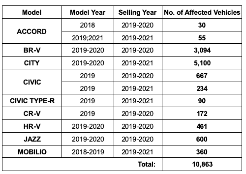 In a statement, HCPI said that it’s recalling 10,863 units of select 2018-2021 Accord, BR-V, City, Civic, Civic Type R, CR-V, HR-V, Jazz and Mobilio to replace their fuel pumps.