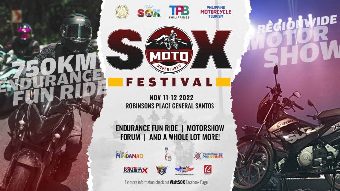 SOX Moto Adventures Festival headlines the event, happening on November 11-12, 2022 at Robinson’s Place, General Santos City. It is anticipated to be the biggest moto-riding event in the whole region this year with over 250 riders from all over Mindanao (and some from the Visayas), joining the 750-km Endurance Fun Ride, motor show, and motor convention.