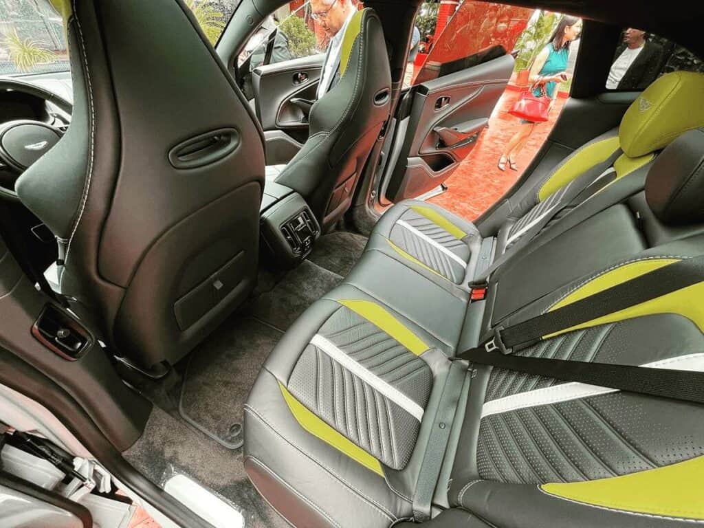 Stepping inside the DBX707, the use of carbon fiber continues with trim on the digital gauge cluster housing and center console. Most of the soft-touch surfaces are wrapped in leather, as are the seats. There’s a traditional bench-style rear seat that can accommodate three passengers and can be folded down to increase trunk space. The DBX707 also features a panoramic sunroof, dual-zone automatic air conditioning, rain-sensing wipers, a push-to-start button, and multiple charging ports in the front and rear.