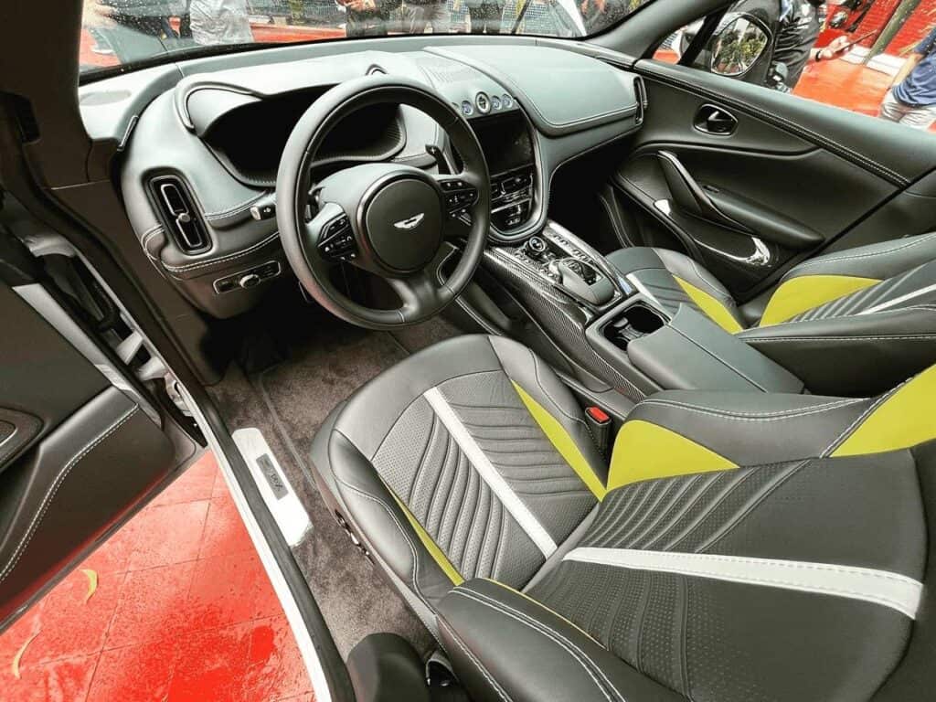 Of note, the DBX707 local unit in Apex Grey color features Phantom Grey seats and is accented with Electron Yellow from the Q Collection. Its sporty appearance is highlighted by yellow brake calipers, black chrome Aston Martin badge, and smoked taillights. The heated steering wheel and front and rear seat ventilation options provide an elevated driving experience. This unit is dealership-configured but can be customized through an indent order for those who desire a personalized touch.