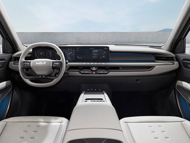 Throughout the spacious, light, and airy cabin, the EV9 embodies an elegantly simple, premium, and exceptionally user-friendly design. The open, floating panoramic dashboard extends from the steering wheel to the vehicle’s center. Two 12.3-inch touchscreens integrated with one 5-inch segment display improve the digital experience, offering effortless control of the vehicle’s functions.