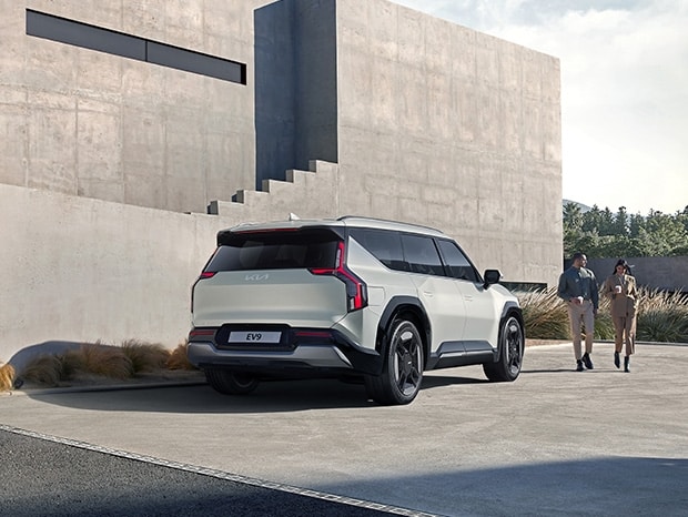 The simple, clean lines of the tailgate are elegantly detailed by the slim rear lights that mirror the design of those at the front, further reflecting the EV9’s strong and confident stance.