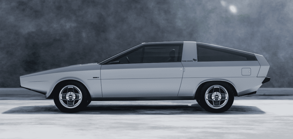 The Pony Coupe Concept, with its striking geometric lines, bears resemblance to the Lamborghini Countach, another legendary vehicle that debuted in 1974. The coupe’s revolutionary design language incorporated flowing lines, circular headlights, a chunky B-pillar, and a distinctive cut-off tail, setting it apart from its contemporaries. At a length of approximately 160.6 inches, the Pony Coupe Concept appears larger in pictures than its compact dimensions suggest. Its modest height of 47.6 inches contributes to its sporty and dynamic appearance, emphasizing its coupe character.
