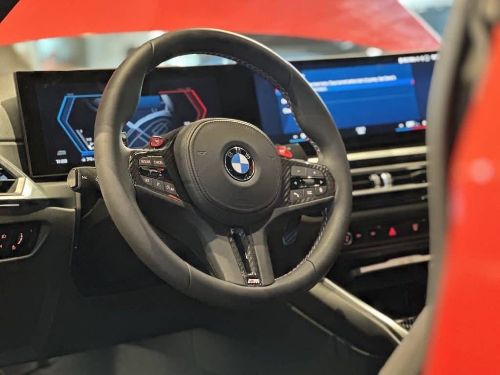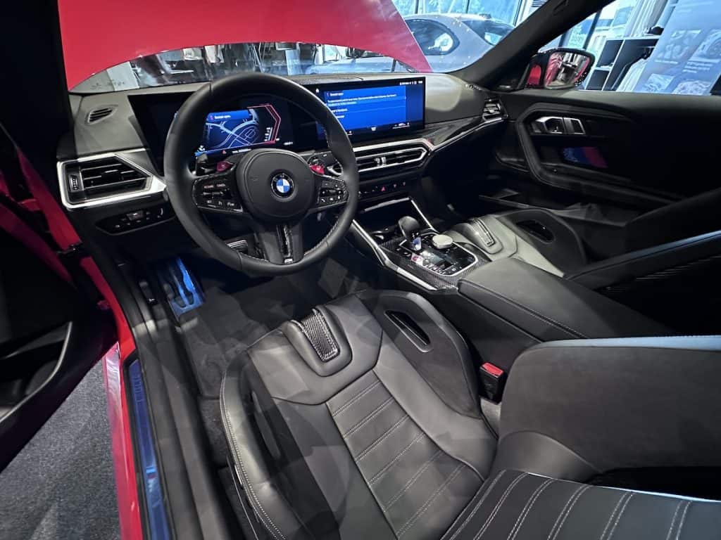 Stepping inside the M2 is like entering the cockpit of a high-performance aircraft. Bucket seats embrace the driver and passengers, with the M2 Coupe Carbon boasting M Sport seats made of carbon fiber and upholstered in luxurious Merino Black leather. The Coupe Pure, on the other hand, features an “Aluminum Rhombicle Anthracite” interior trim and Alcantara/Sensatec for a more understated look. Carbon fiber interior trims adorn the Coupe Carbon, accentuating its sporty appeal.