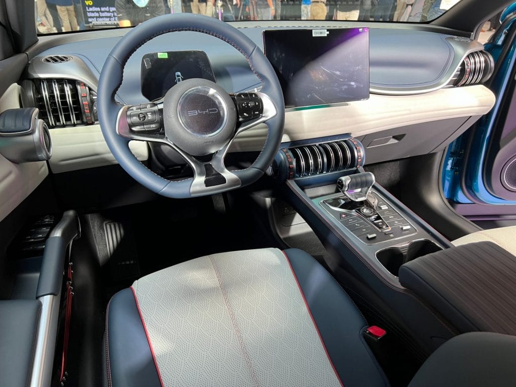 The interior of the Atto 3 is unique with its vertical slats on the corner air vents, center console, and rear air vents. There’s an interplay of colors with navy blue, creamy white, and silver all over the cabin. Those who are particular with their sunroof covers will appreciate the solid cover for the glass and its gray finish.
