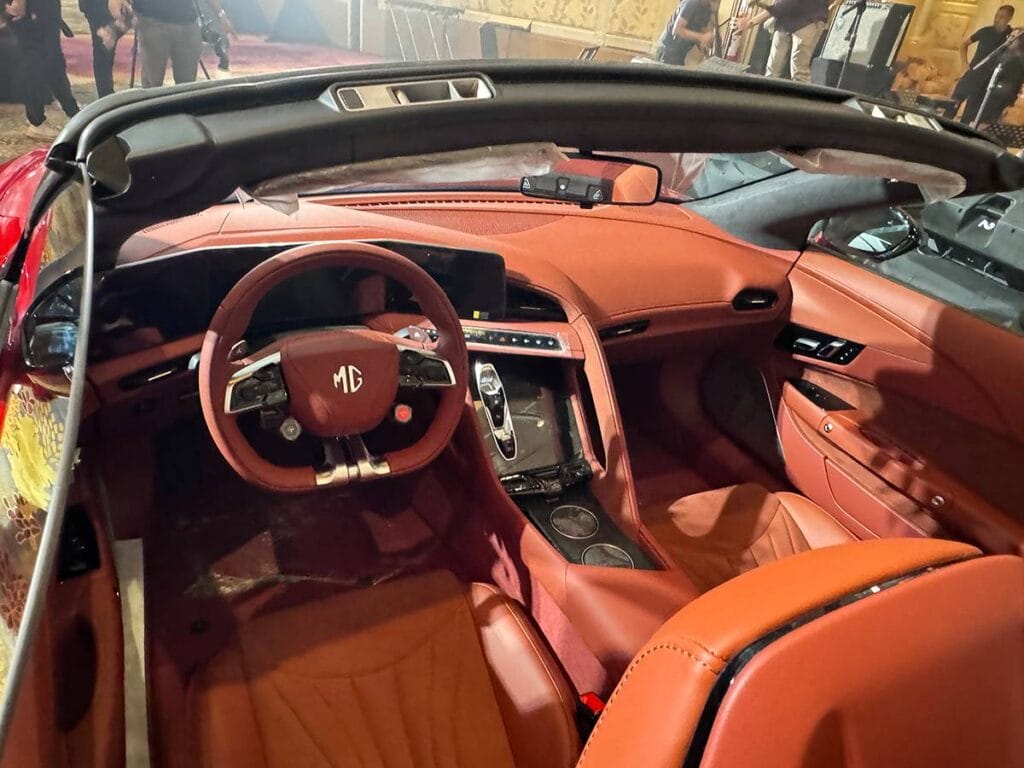 Inside, the MG Cyberster, it has triple LCD screens centered towards the driver, a flat-bottomed steering wheel, a slew of physical buttons and controls, and acres of leather and Alcantara. The cockpit itself is powered by a Qualcomm Snapdragon 8155 chip making it ultra-responsive, while the aural experience is enhanced by a Bose sound system.