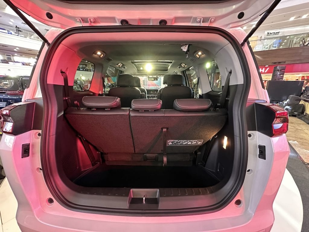 The top-spec model features PVC leather upholstery, 4-way adjustable captain seats in the second row, and a 60:40 split-folding bench seat in the third row, accommodating a 2+2+3 seating configuration with ample cargo space of up to 1,100 liters when all seats are folded down.