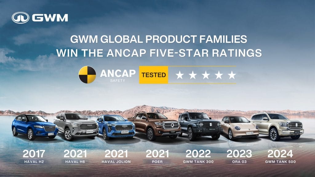 GWM has consistently received 5-star safety ratings from the ANCAP since 2017 when the GWM HAVAL H2 received such. This was followed in 2021 by the GWM HAVAL H6 and HAVAL Jolion, and GWM POER; in 2022 by the GWM TANK 300; and in 2023 by the ORA 03.