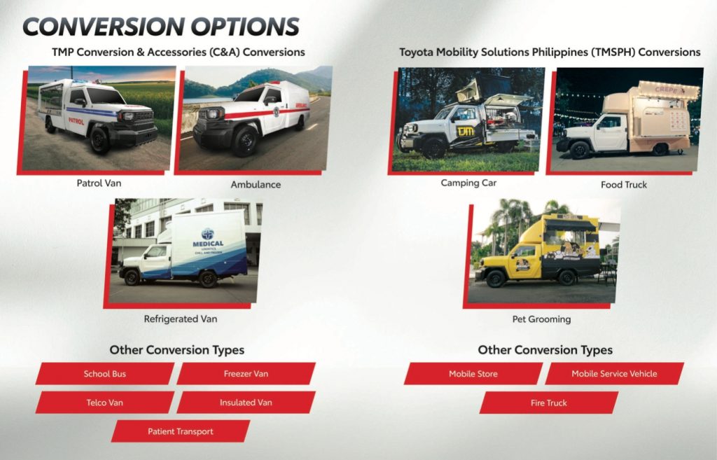Apart from these standard bodies, Toyota offers two sets of conversion and customization for the Tamaraw. Toyota Motor Philippines can sell it as a Police Patrol Van, Ambulance, Refrigerated Van, School Bus, Freezer Van, Telco Van, Insulated Van, and Patient Transport Mobile. On the other hand, Toyota Mobility Solutions will offer it as a Camping Car, Food Truck, Roving Pet Grooming Truck, Mobile Store, Mobile Service Vehicle, and as a Fire Truck.