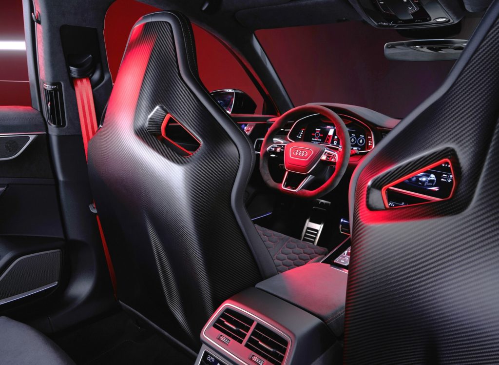 Inside, the RS 6 Avant GT offers a luxurious and high-tech cabin, designed for both comfort and performance. RS full carbon fiber bucket seats provide exceptional support, complemented by unique color combinations and individual vehicle numbering that personalize the experience. The Audi Virtual Cockpit displays critical information in a customizable format, while the flat-bottom sport contour leather steering wheel invites spirited driving. Features like MMI navigation plus with MMI touch response and a Bang & Olufsen 3D sound system elevate the driving experience.