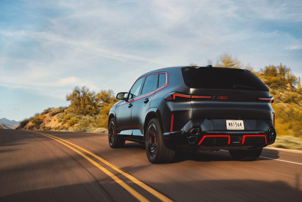 The rear is an exclusive M Lounge with its generous space and high-quality materials. The heated backrests extend to the sides of the cabin and are clad in Merino leather with red contrast stitching and “XM” badge give passengers luxurious levels of comfort. Together with the sculptural headliner, the dark windows, and comfort cushions, the rear of the XM Label Red creates a novel feeling of space.