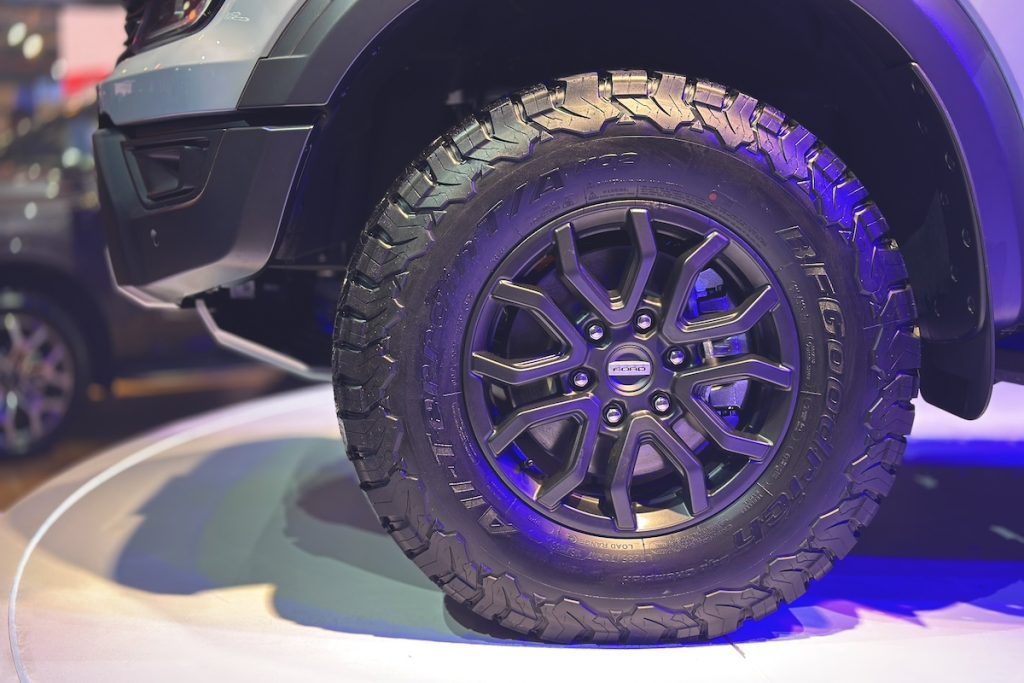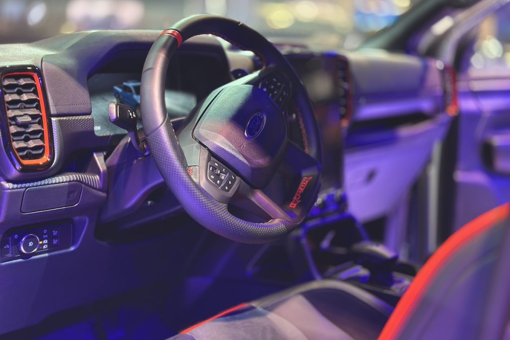 The new Ranger Raptor’s bold exterior design complements its rugged performance. The signature F-O-R-D wordmark on the grille, flared wheel arches, and Matrix LED headlights with dynamic bending lights make the truck stand out on and off the road. The 17-inch wheels, wrapped in BFGoodrich all-terrain tires, add to the truck’s tough, muscular look, while functional design elements like off-road side steps enhance its practicality.
