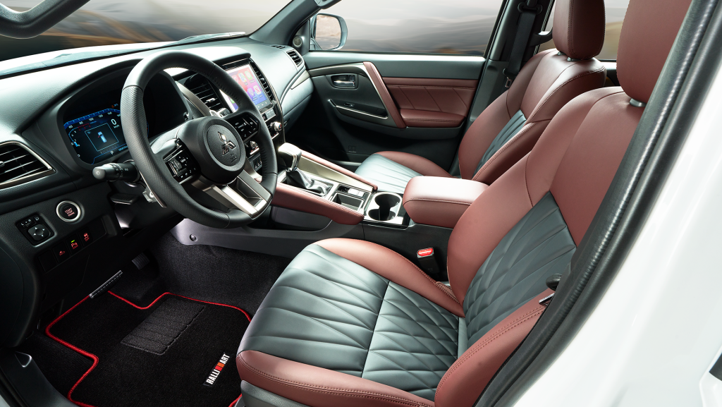This edition stands out with its striking White Diamond with Black Roof exterior body color and RALLIART-inspired side decals. Mitsubishi Motors Genuine Accessories drive up the model’s sporty and active demeanor. This is further enhanced with black front and rear under garnishes with red accents, giving the vehicle a powerful presence from every angle. Red mud flaps add an extra layer of style and function, keeping the ride ready for the road’s kickbacks. Black wheel arch moldings complement the vehicle’s fenders. Inside, exclusive RALLIART-branded floor mats await you, adding a dash of excitement to Montero Sport’s comfortable and sophisticated interior.