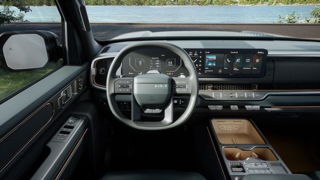 Kia has also focused on making the Tasman’s interior both tech-friendly and comfortable. Inside, the Tasman features a 10.25-inch touchscreen infotainment system that supports both Apple CarPlay and Android Auto, along with multiple USB ports and a wireless charging pad. The Tasman’s digital cluster provides key vehicle information, navigation, and drive mode selections, all within easy view. Premium trim levels come with leather seating, a sunroof, and dual-zone automatic climate control, giving the Tasman a more upscale feel.