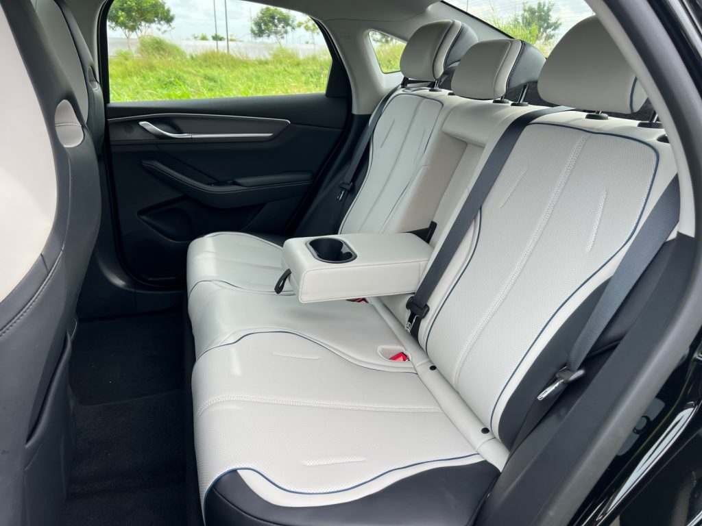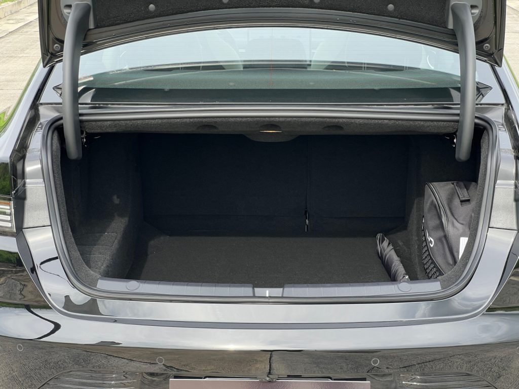 The cabin is clad in shades of white, gray, with navy blue piping and stitching in key areas. Leather upholstery is standard even in the base model. It also features bucket-style seats for the front occupants that’s available with powered adjustment for the driver. BYD’s signature rotating 12.8-inch touchscreen with Wireless Apple CarPlay and Wireless Android Auto made its way into the Seal 5 DM-i, as well as the 8.8-inch digital instrument cluster. There’s a high center console that hosts the shifter and wireless charger and underneath that is a cubby hole that also has USB ports and the 12-volt socket for a cleaner overall look.