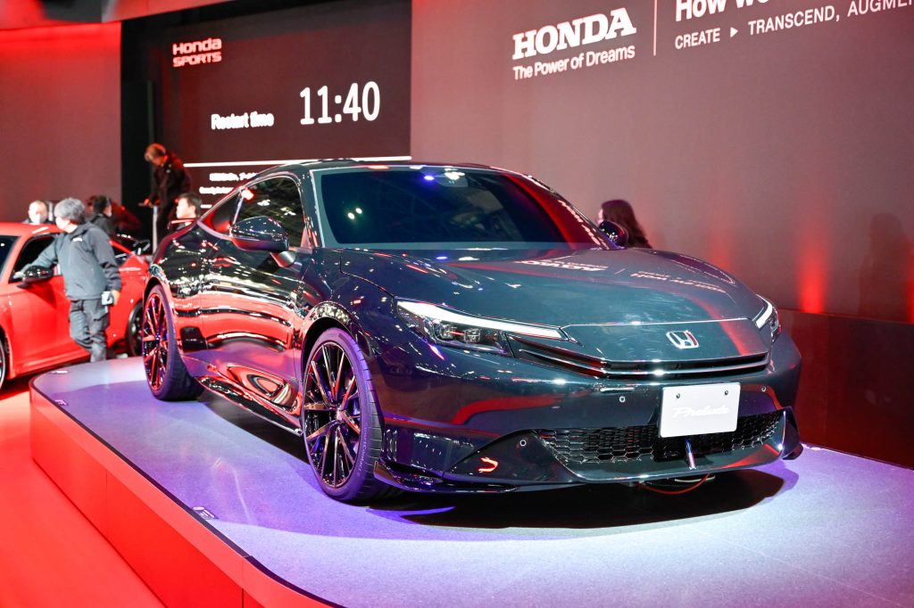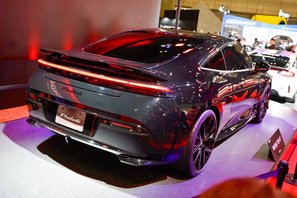 Taking center stage is a Prelude Prototype fitted with aero parts from Mugen such as a lip, side skirt, and rear spoiler, showcasing Honda’s upcoming hybrid sports coupe. This was first shown in concept form at the 2023 Japan Mobility Show.