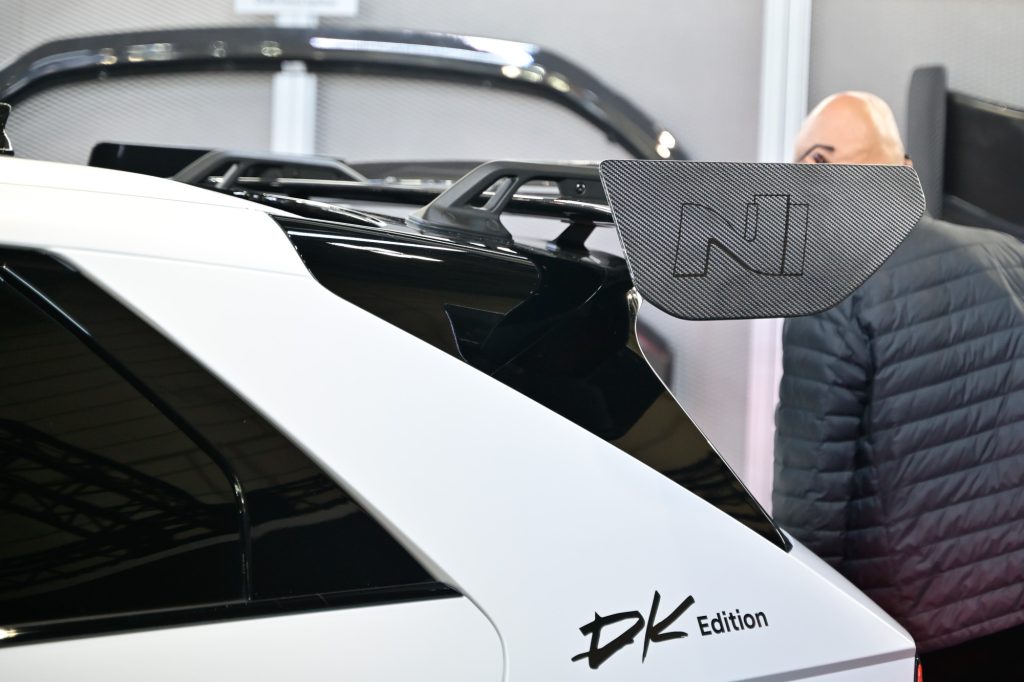 Unlike the standard Ioniq 5 N, this model wears carbon fiber parts on its body and the large swan-neck rear wing, new 21-inch HRE multi-spoke wheels that house Winmax six-piston brakes, H&R lowering springs, a white-and-green livery (the Drift King’s colors), and some tweaks to improve the “driftability” of the vehicle.