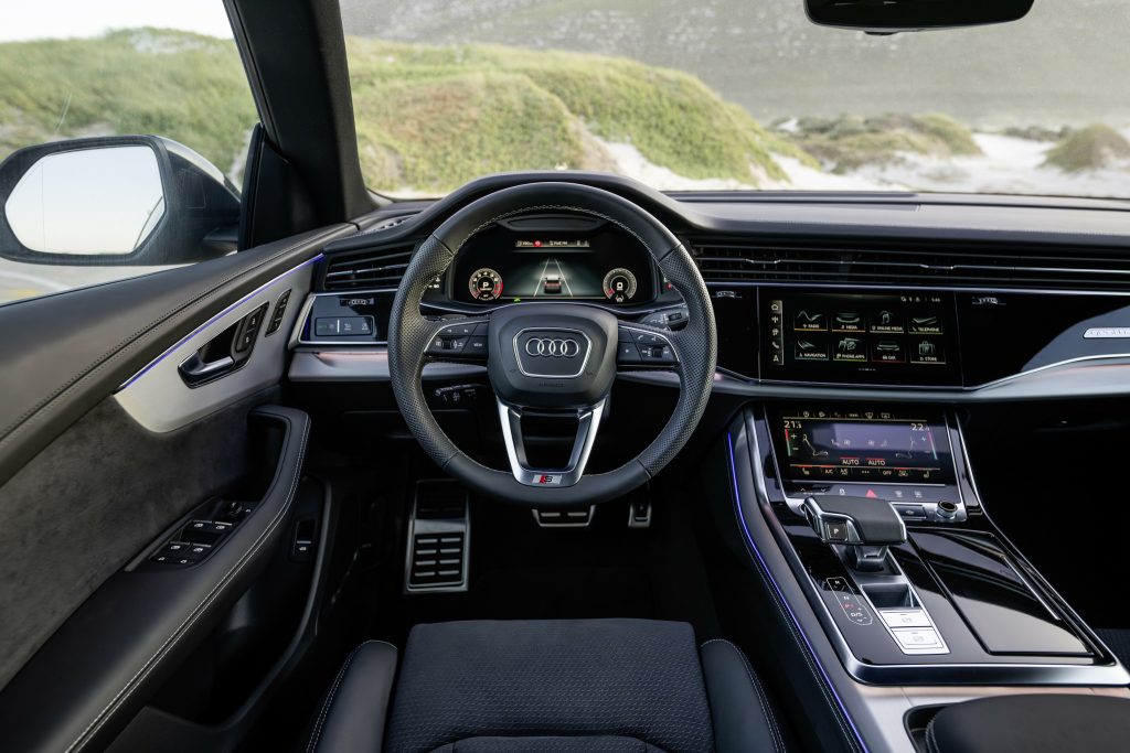 Audi has further refined the equipment range for the new Q8. Among the vast collection of items are the enhanced Audi virtual cockpit and MMI touch response system, cabin trim in silver gray with diamond finish inlays, a Bang & Olufsen premium audio system, the multi-configurable ambient LED interior lighting package plus, extended interior elements in leather, seats wrapped in a combination of perforated Valcona leather and Cricket leather, four-zone automatic air-conditioning with the air quality package, and illuminated S line door sills with aluminum inserts.