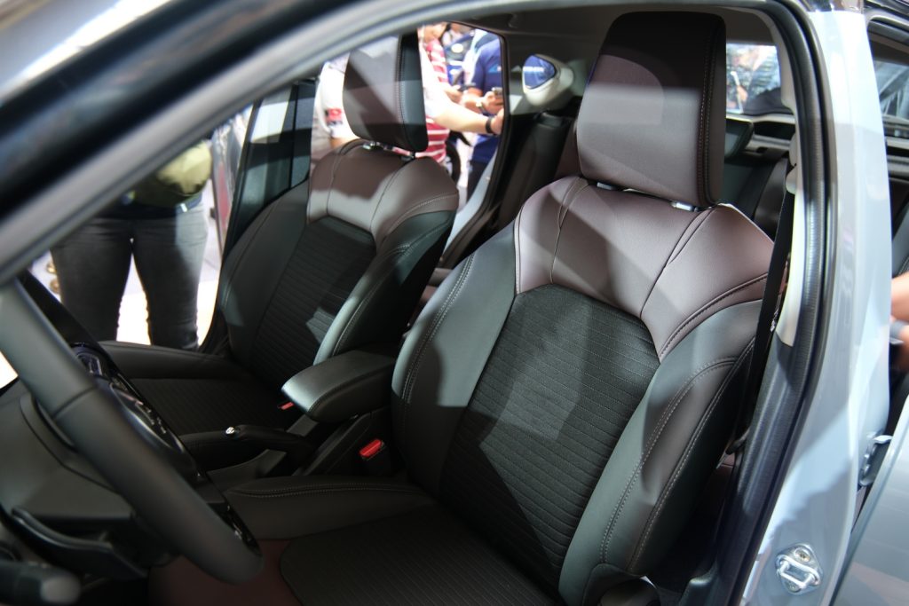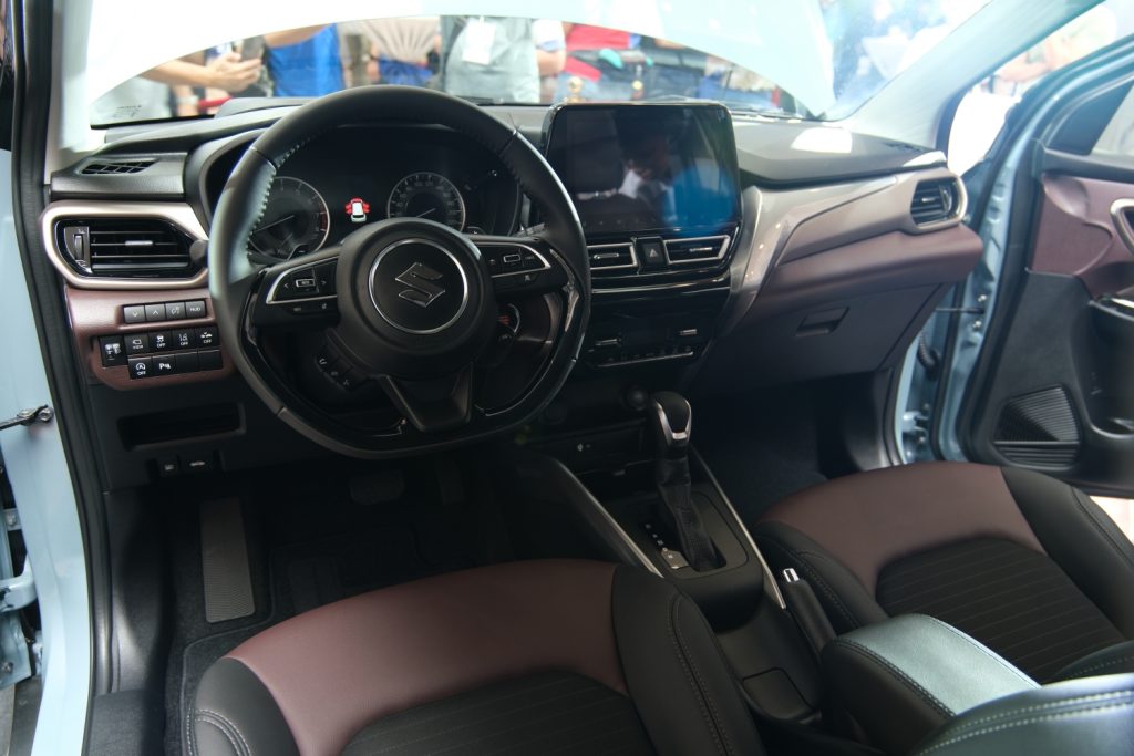 Inside, there’s a 2-tone upholstery for the variant on display. The rear seats have their own air vents and twin charging ports, while the front has a floating-type touchscreen display, a steering wheel that seems taken from the Swift, tactile controls for the aircon, and a digital screen flanked by the analog gauges. There’s also a wireless charger under the aircon unit.