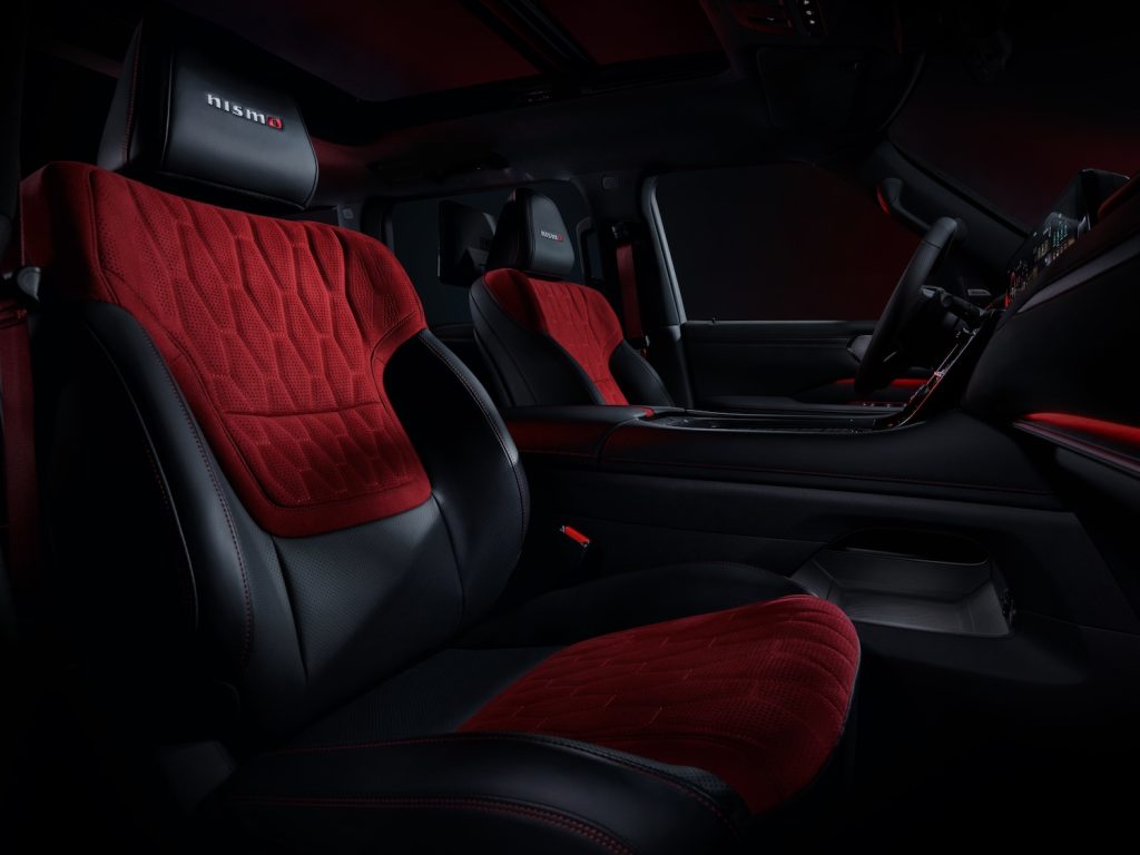 Inside, the cabin keeps up the sporty theme. You get Nismo-exclusive quilted leather seats in charcoal and red, adjustable side bolsters, aluminum pedals, and even a red 12 o’clock marker on the steering wheel—because why not? Front massaging seats are included too, a feature otherwise reserved for the top-end Platinum Reserve.