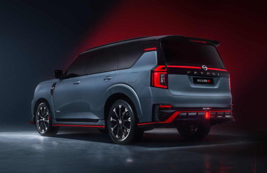 Visually, the Patrol Nismo makes zero effort to fly under the radar. It borrows plenty of attitude from the GT-R Nismo and Z Nismo, including a roof-mounted rear spoiler, unique front and rear bumpers, wider fender flares, and red accenting throughout. New LED fog lamps, Nismo badging, and red-painted brake calipers round out the package.