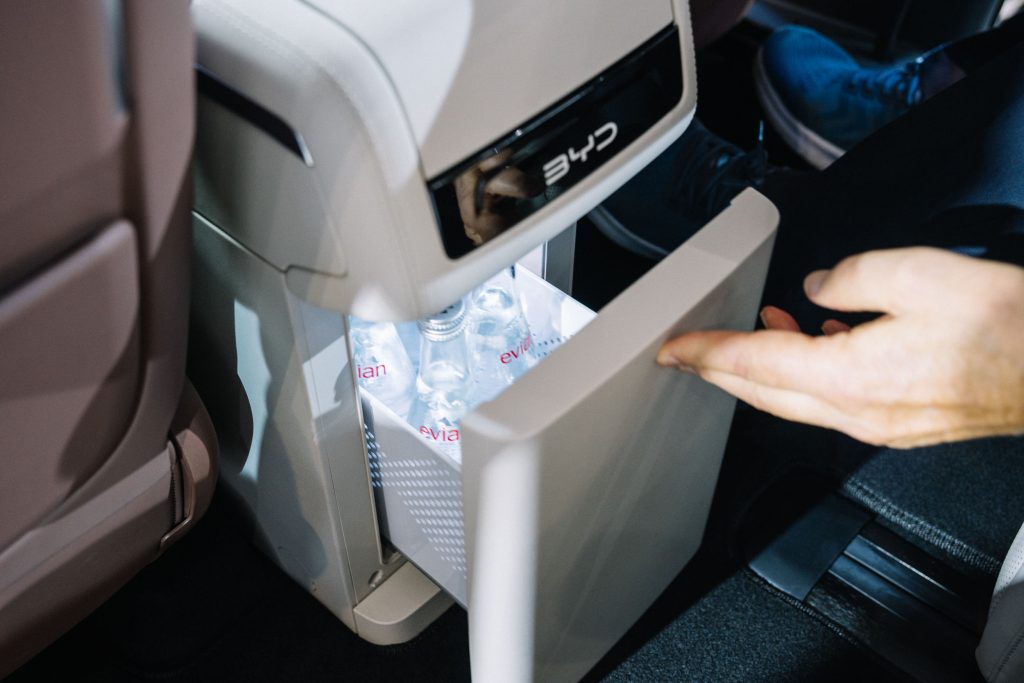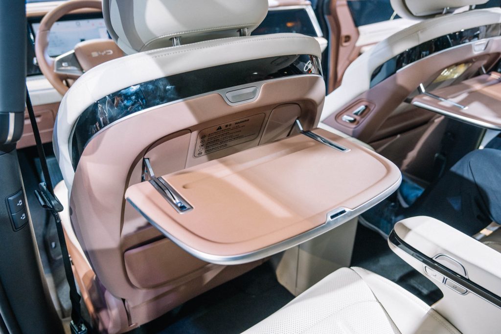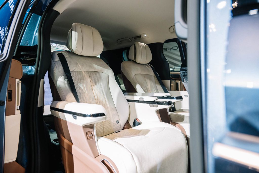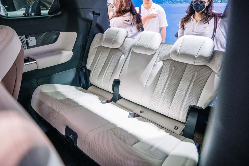 The interior can seat seven people with its power-operated third-row bench, but all eyes are on the second-row seats. On the Premium variant, the second-row seats feature heating, ventilation, power adjustments, and massaging functions with an ottoman function, topping it off with a built-in refrigerator. Otherwise, the Advanced gets manual second and third-row seats and a storage cabinet instead of the refrigerator.