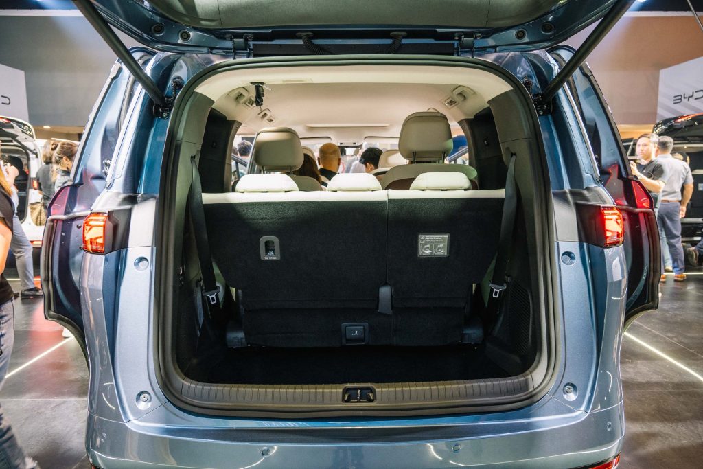The exterior of the eMax 9 DM-i announces itself with a lot of road presence thanks to its Dragon Face design language with a large grille, full LED lighting front and back, dual power sliding doors, a power tailgate, and 18-inch wheels for both variants. It measures 1,970mm wide, 1,805mm tall, and 5,145mm long with a wheelbase of 3,045mm. It’s offered in three colors: Deep Sea Blue, Cosmos Black, and Aurora White.