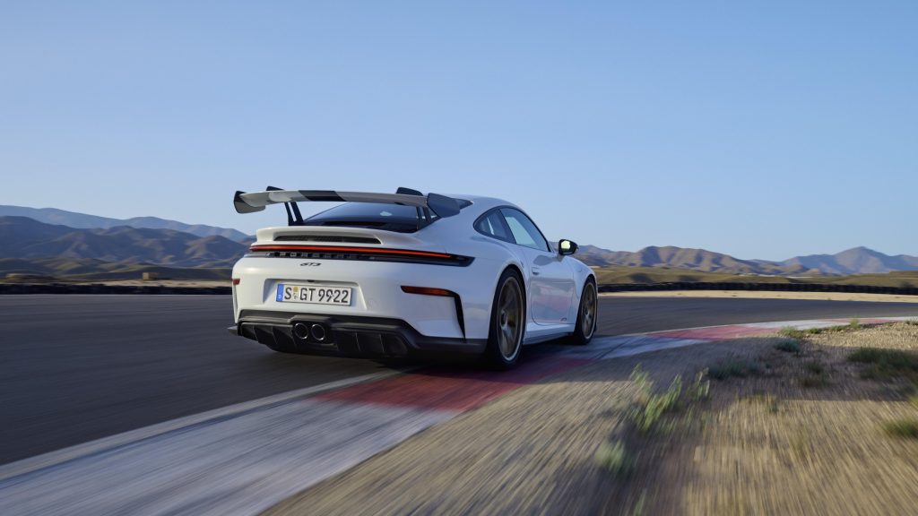 The new GT3 features sharpened aerodynamics and reduced weight. Revised front aerodynamic elements—including the diffuser, spoiler lip, and underbody fins—improve airflow and increase downforce. Redesigned Matrix LED headlamps integrate all lighting functions into a single unit, allowing for larger front air intakes. At the rear, a redesigned diffuser, cooling inlets, and newly angled wing sideplates enhance aerodynamic efficiency and thermal management.