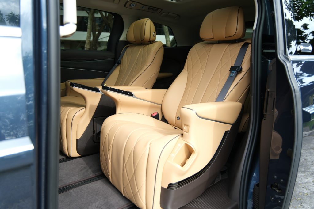 Living up to its tagline, the second row is definitely the place to be. The captain seats are wider and have a Zero Gravity function. This reclines the whole seat up to 152 degrees and pushes out the leg rest for a full body pressure relief and relaxation. This is accompanied by a touch-based control screen on the armrest that lets you control the 10-point massage, heating, ventilation, and other things in the area. You can adjust the sunshade of the panoramic roof, the second row’s aircon, and even the temperature of the 7.5L fridge that can go from -6° to 50° to keep drinks cold or food warm.