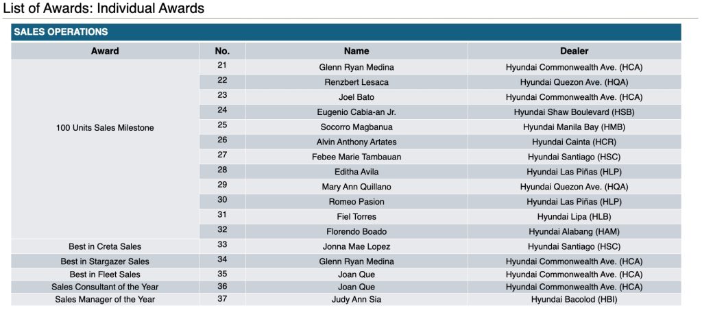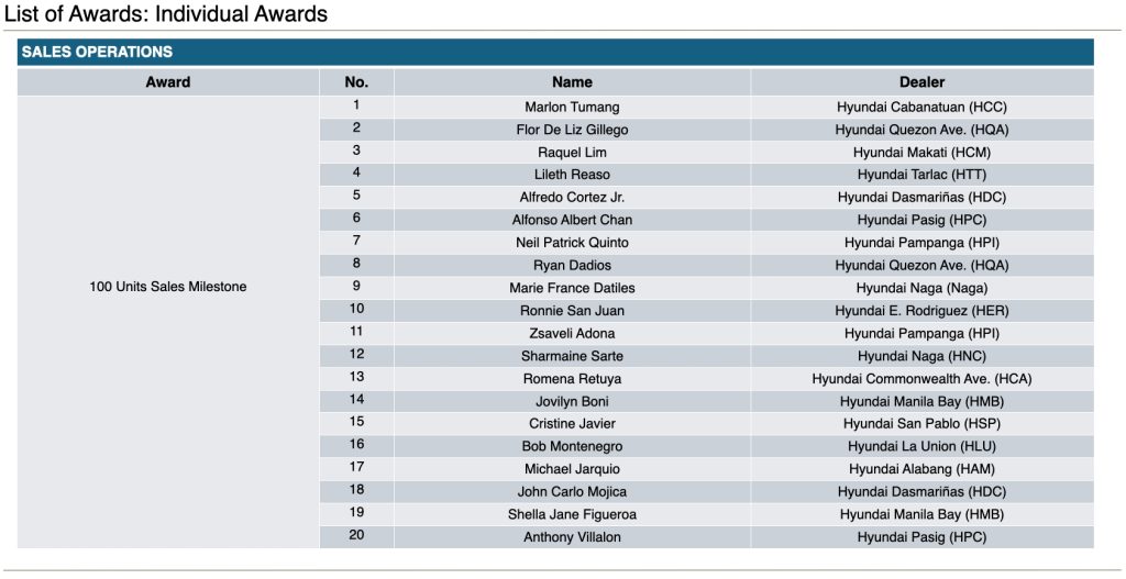 Led by Attorney Anna Lyne San Juan-Ponferrada, President of Prince Motor Corporation, Hyundai Commonwealth emerged victorious, solidifying its reputation as a top-performing dealership. Following closely behind were Hyundai Bacolod and Hyundai Alabang, securing first and second runners-up, respectively.