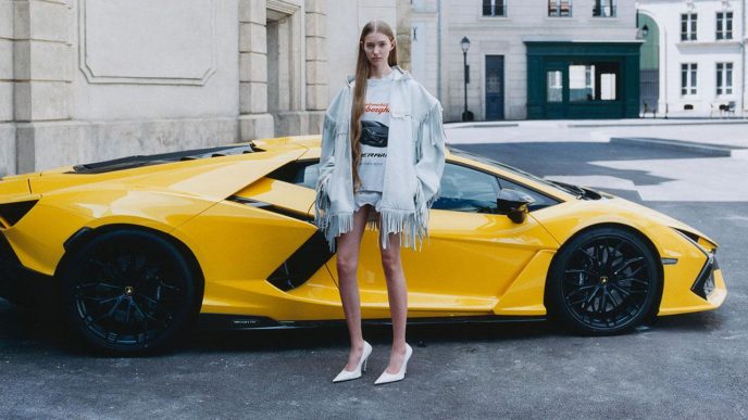 The Balenciaga | Automobili Lamborghini campaign—lensed by photographer Stef Mitchell—features the Lamborghini Revuelto with models wearing looks from the Fall 25 collection styled with pieces from the series.