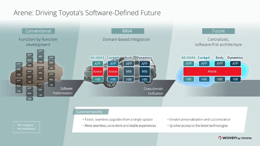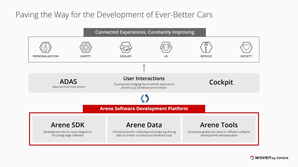 The Arene Software Development Kit ensures that all suppliers of a Toyota vehicle are working on the same platform to maximize coordination, and simplify integration and testing. It also allows the product to be reused in other applications and other models unlike before where every application and car models needs a specific software code.