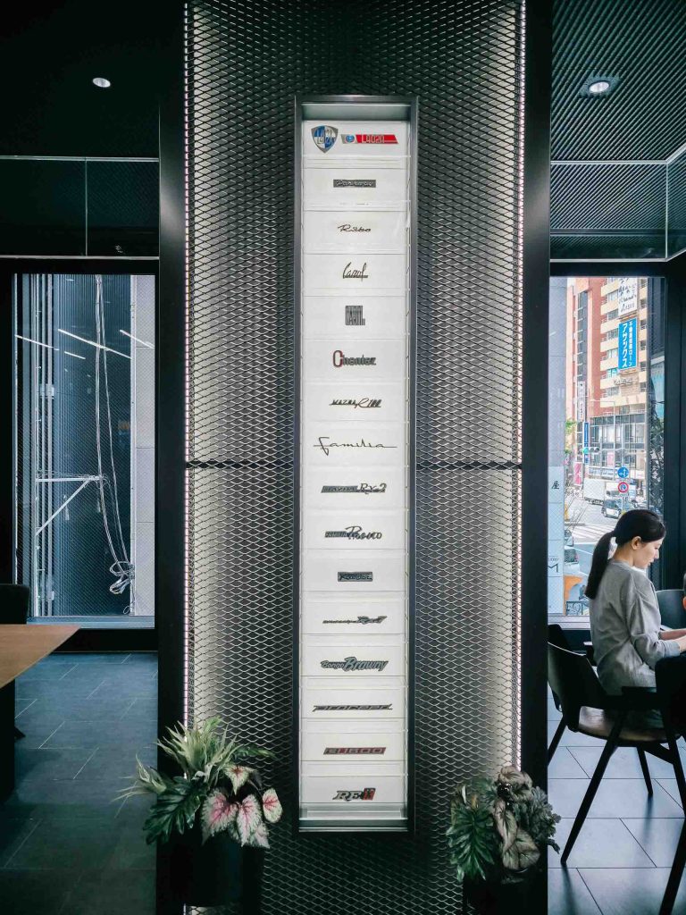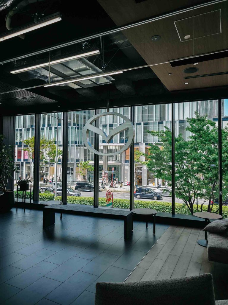Also located on two pillars are scale models and badges of various cars, and the highlight is Mazda’s new corporate logo is seen hanging by the main window that overlooks the Tokyo Route 246.
